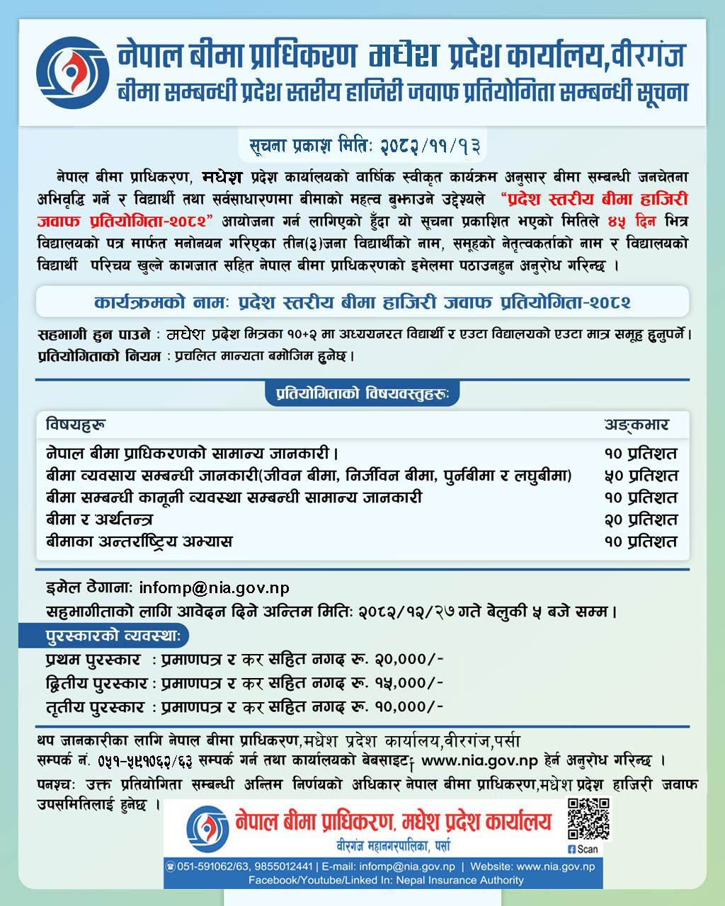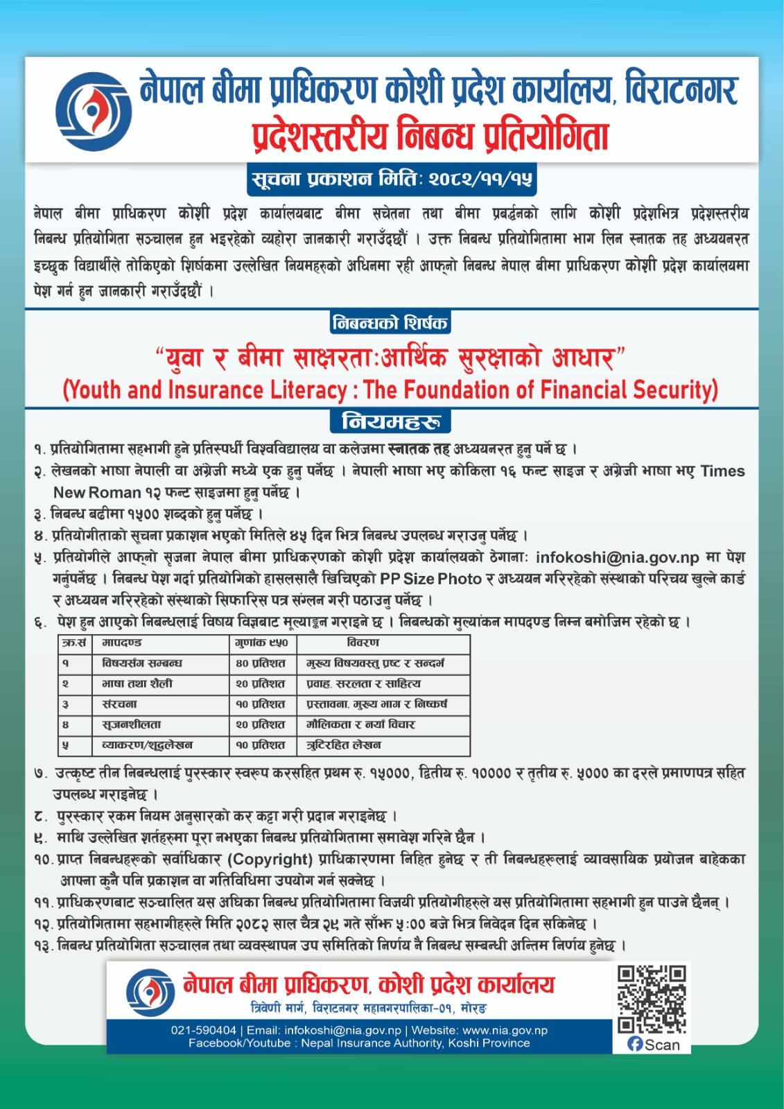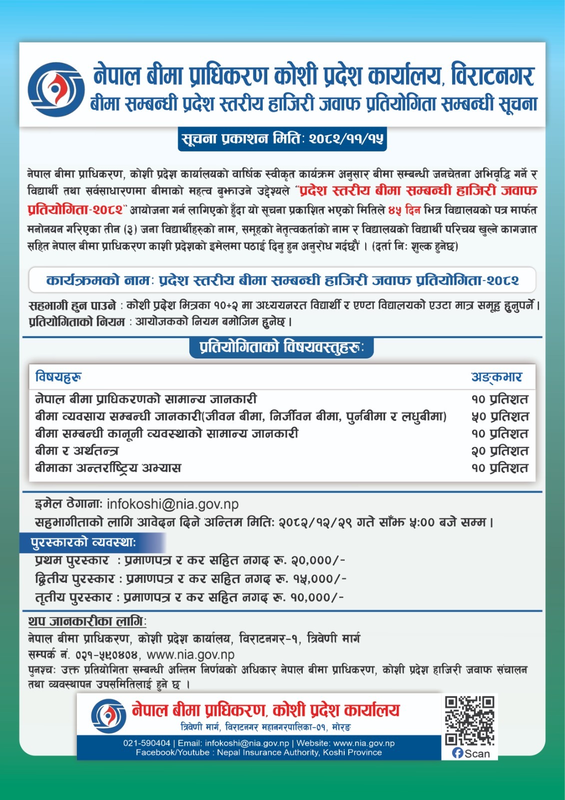 हुलाक टिकटको सम्बन्धमा।     शिलबन्दी प्रस्ताव पेश गर्ने बारे ।     बीमा प्रवर्द्धनात्मक कार्यक्रम संचालन गर्ने सम्बन्धमा ।     असोज १८ गते देखि अविरल बर्षा तथा बाढि पहिरोको कारणले भएको क्षतिबाट बीमा दावीको विवरण।     भाद्र २३ गतेदेखि उत्पन्न असहज परिस्थितिका कारण श्रृजित बीमा दाबीको विवरण ।     According to the Insurance Act 2079, the insurance nature of the business need to be registered in Nepal Insurance Authority.
