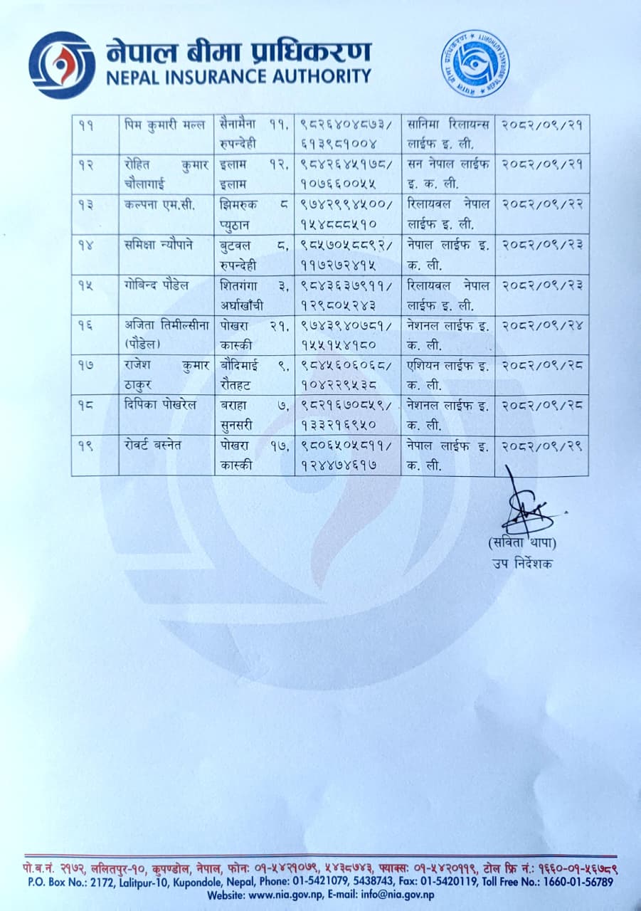 बीमा प्रवर्द्धनात्मक कार्यक्रम संचालन गर्ने सम्बन्धमा ।     असोज १८ गते देखि अविरल बर्षा तथा बाढि पहिरोको कारणले भएको क्षतिबाट बीमा दावीको विवरण।     भाद्र २३ गतेदेखि उत्पन्न असहज परिस्थितिका कारण श्रृजित बीमा दाबीको विवरण ।     According to the Insurance Act 2079, the insurance nature of the business need to be registered in Nepal Insurance Authority.