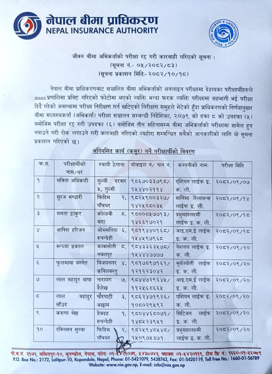file जीवन बीमा अभिकर्ताको परीक्षा रद्द गरी कारबाही गरिएको सूचना ! file 2026-02-01 eye हेर्नुहोस्