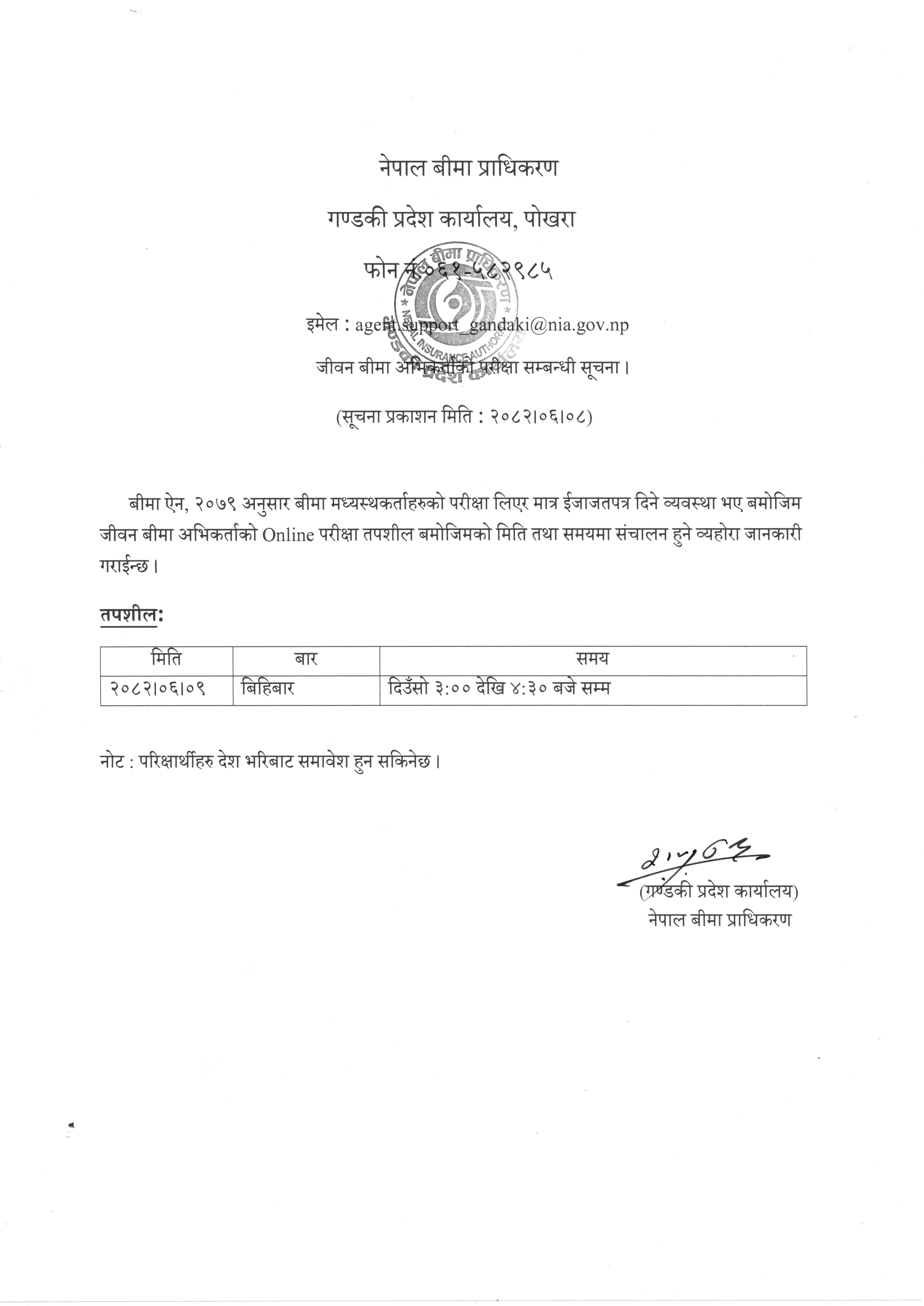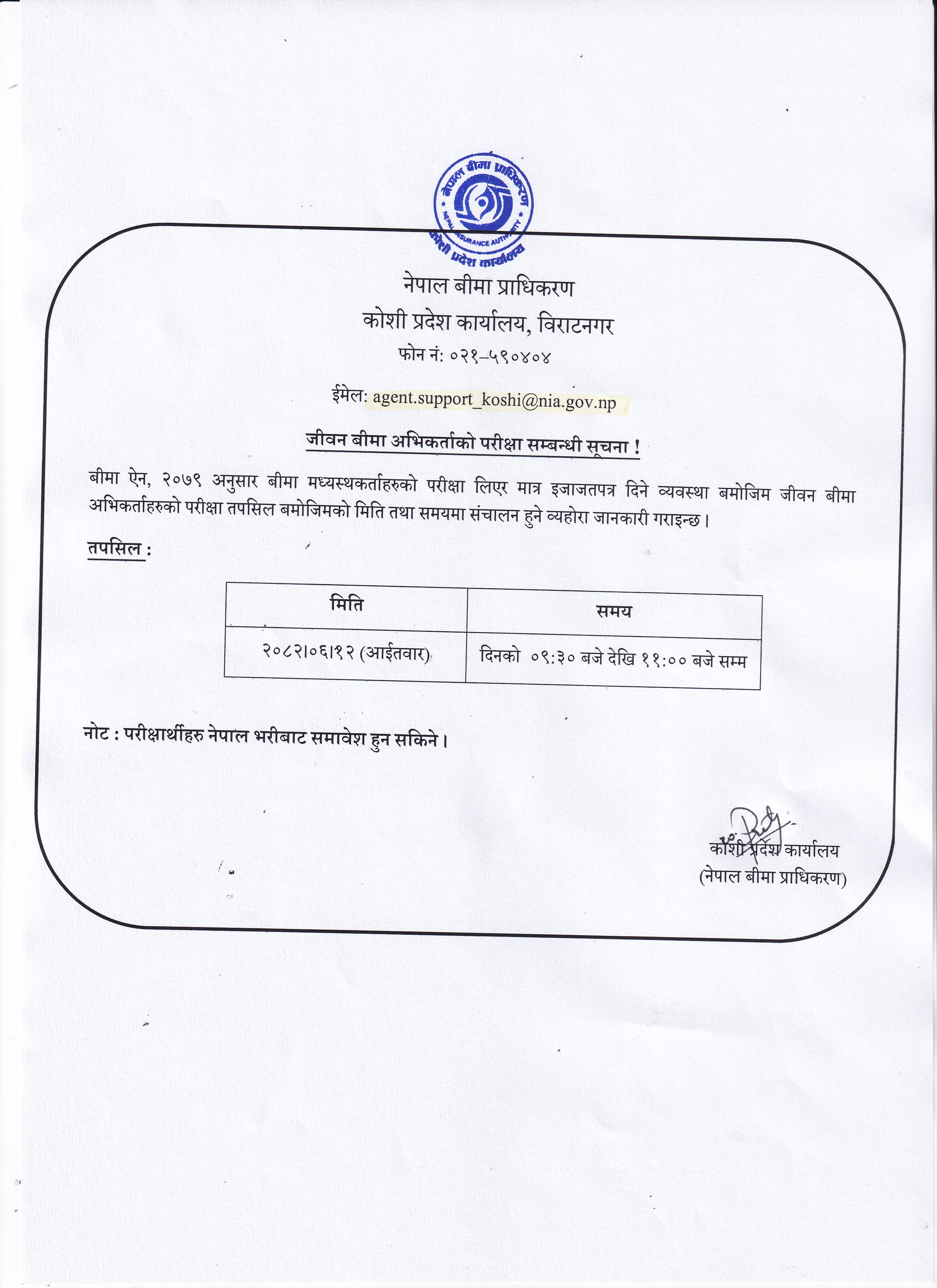 सुरक्षागार्ड आपूर्ति गर्ने सम्बन्धी बोलपत्र आह्वानको सूचना ।     असोज १८ गते देखि अविरल बर्षा तथा बाढि पहिरोको कारणले भएको क्षतिबाट बीमा दावीको विवरण।     बोलपत्र आह्वानको सूचना ।     भाद्र २३ गतेदेखि उत्पन्न असहज परिस्थितिका कारण श्रृजित बीमा दाबीको विवरण कार्तिक ९ सम्मको ।     विदेशी पुनर्बीमा दलालको कार्यालय स्थापना गर्ने सम्बन्धमा     कृषि तथा पशुपन्छी बीमा प्रणालीको प्रयोगकर्ता म्यानुअल।     According to the Insurance Act 2079, the insurance nature of the business need to be registered in Nepal Insurance Authority.